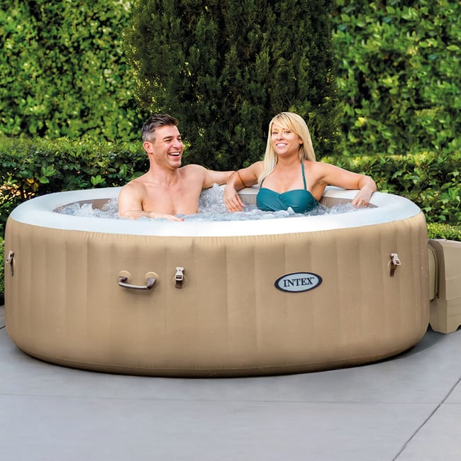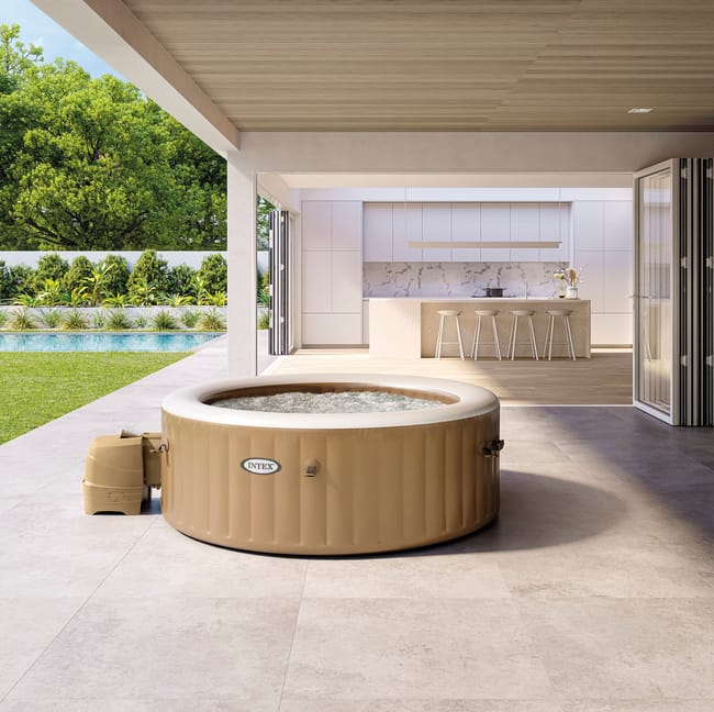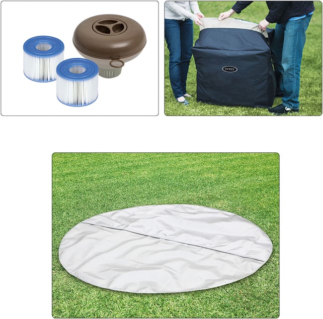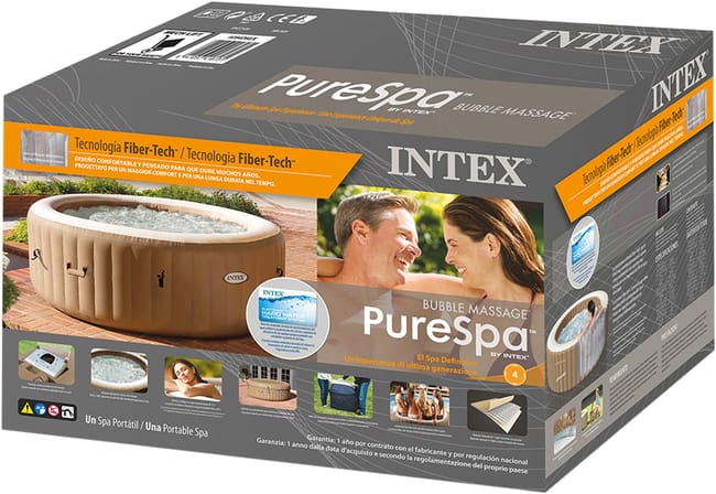 Spa de exterior hinchable INTEX Burbujas con 120 salidas de aire y una capacidad de 795 litros. Ideal para 4 personas. Fabricado en lona de PVC laminado triple capa y estructura Fiber-Tech. Panel de control y depuradora de cartucho 1741 l/hora (incluye 2 filtros S1) y sistema antical. Incluye tapiz, cobertor, bolsa de transporte, dispensador de cloro flotante y tiras de verificación del pH. .Posibilidad de mantenerlo todo el año gracias a su calentador/enfriador de agua. Cuenta con sistema de inflado automático. Medidas: 1,96 x 0,71 m (diámetro x alto).
