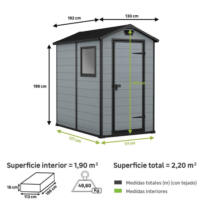 Este cobertizo está diseñado para ofrecer una protección duradera y segura para tus herramientas de jardín. Puede instalarse sobre una losa de hormigón (dimensiones 118 x 185 cm), y se entrega en un paquete compacto de 113 x 16 x 199 cm.
