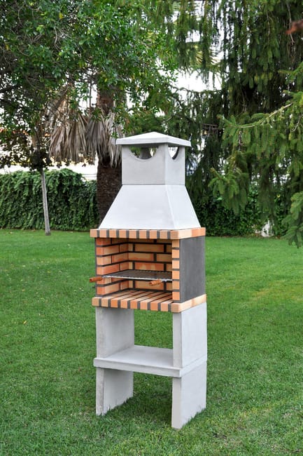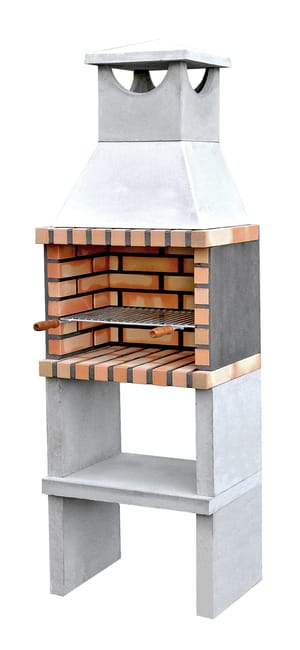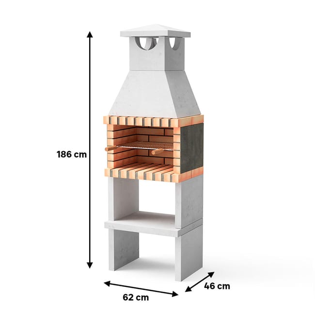 Barbacoa de obra modelo Zon para carbón y leña, con función grill, recomendada para 8 comensales. Está fabricada en ladrillo de color gris. La función grill aporta un extra a la hora de gratinar alimentos. Cuenta con campana, parrilla, encimera y repisa de hormigón. Tiene montaje modular por piezas con silicona. Peso: 295 kg. Se recomienda cumplir la carga máxima de combustible indicada en el manual y no utilizar si no está del todo seca. En este caso, hacer un fuego lento y progresivo solo con carbón hasta secar por completo. Medidas totales: 62 x 186 x 46 cm (ancho x alto x fondo). Parrilla: 51 x 35 cm (ancho x largo).