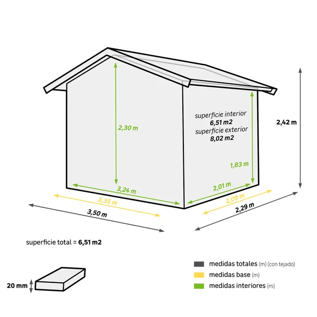 Con dimensiones de 350 x 242 x 229 cm. superficie de 6,51 m². Su diseño práctico facilita el acceso y la organización del interior. La instalación es sencilla y no requiere conocimientos técnicos previos. Una inversión duradera para mantener el orden en tu jardín o terraza.