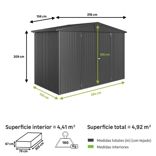 Caseta metálica Europa de 316 x 209 x 156 cm (ancho x alto x fondo) y 4,92 m² de superficie total. Fabricada en acero galvanizado en caliente con acabado resistente y sin mantenimiento. Cuenta con doble puerta batiente y cerradura con llave para mayor seguridad. Incluye estanterías versátiles, varios portaherramientas y sistema system-all integrado para mantener todo en orden y accesible. Espesor de pared de 0,5 mm para una alta durabilidad.