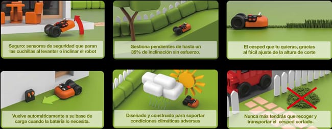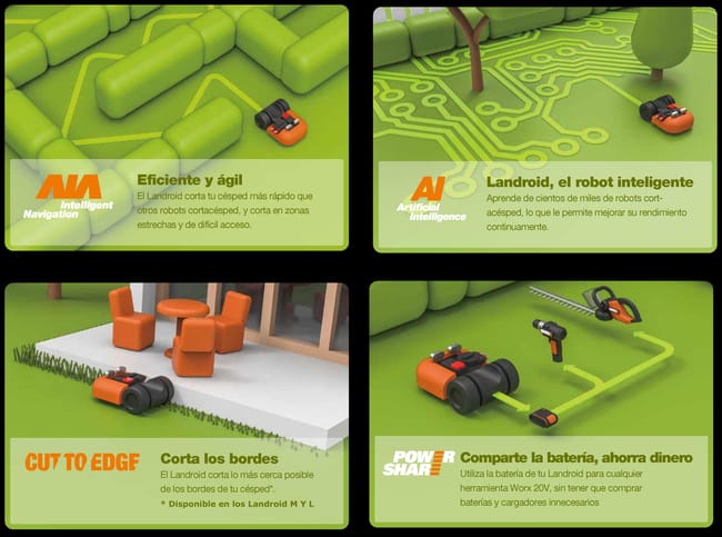 Corta hasta el borde. Apto para pendientes de hasta el 35%. Corte inteligente del césped controlado mediante su App. Indicado para jardines de hasta 300 m²