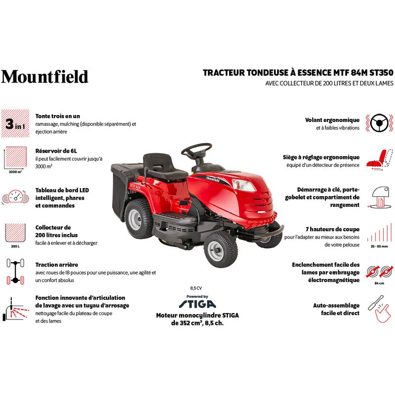 El Mountfield MTF 84M – Tractor termico es la solución ideal para el mantenimiento eficiente de grandes superficies de césped. Potente, cómodo y fácil de maniobrar, convierte una tarea ardua en una ac