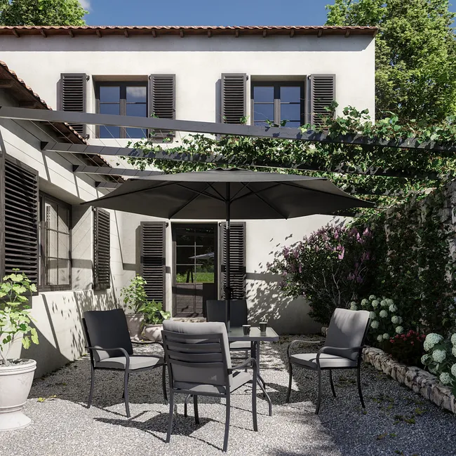 Transforma tu jardín o terraza en un espacio de vida acogedor con NATERIAL Set de mobili de jardín en acero Rono para 4 persone. De líneas modernas y materiales seleccionados para el exterior, este co
