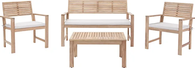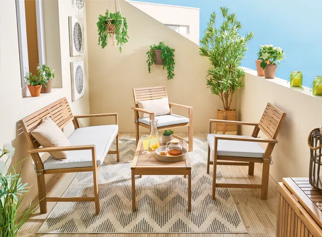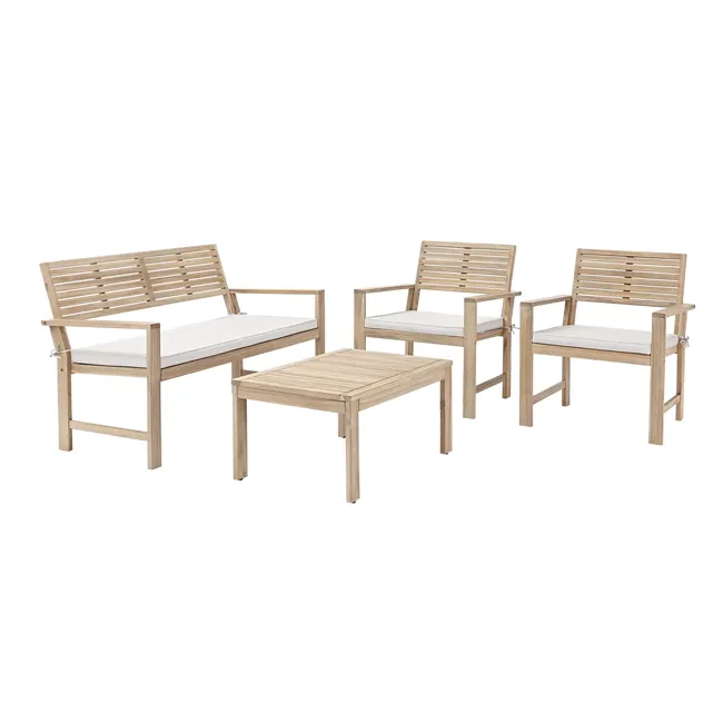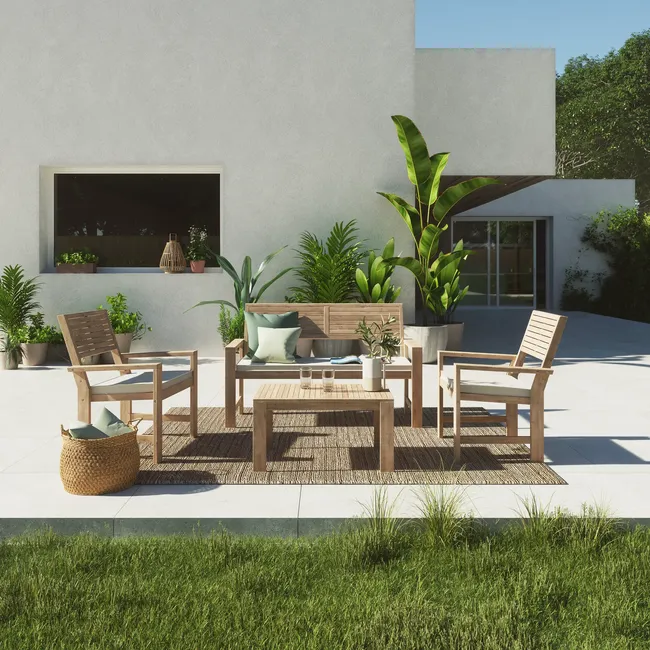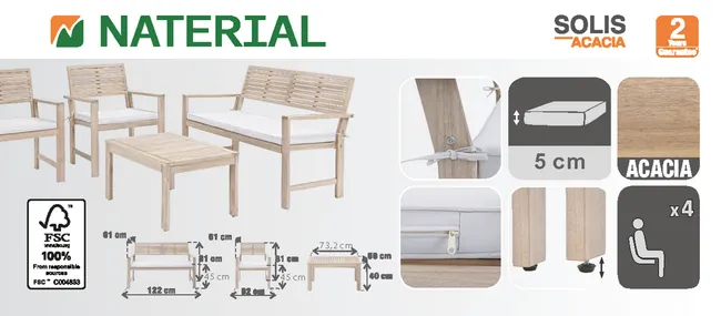 Transforma tu jardín o terraza en un espacio de vida acogedor con NATERIAL Set sofá y tavolino en madera Solís para 4 persone. De líneas modernas y materiales seleccionados para el exterior, este conj