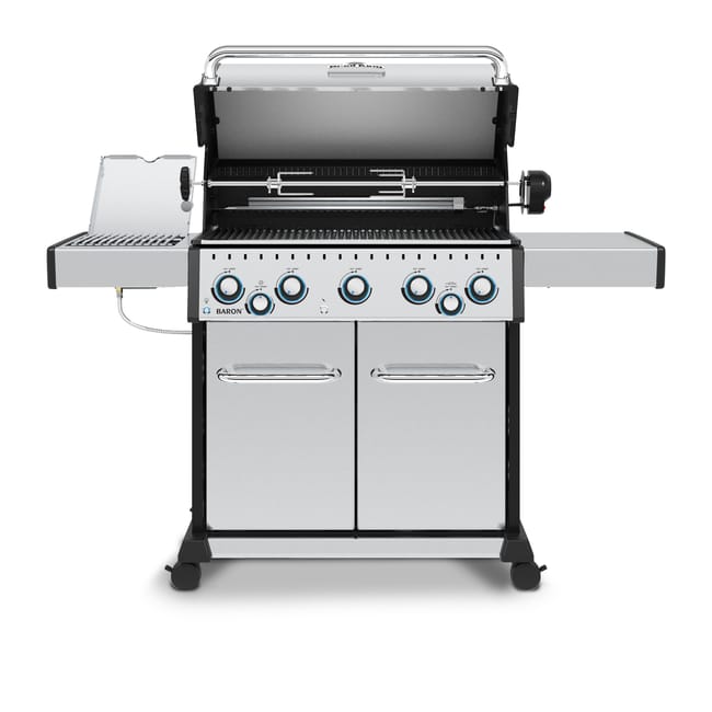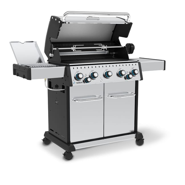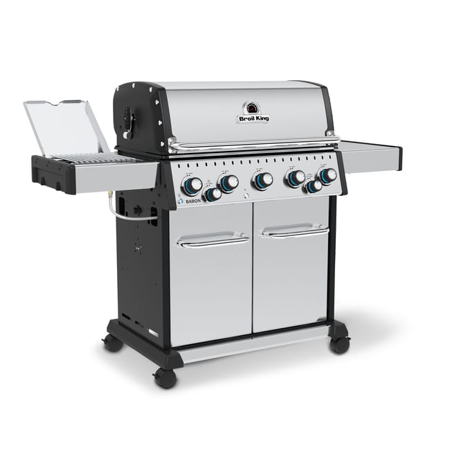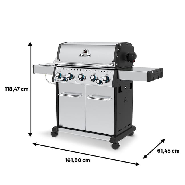 La barbacoa a gas BROIL KING Baron S 590 IR está equipada con 5 quemadores principales, 1 quemador lateral infrarrojo premium y 1 quemador trasero, ofreciendo una potencia total de 20,7 kW (13,2 kW principales, 3,1 kW infrarrojo, 4,4 kW trasero). Con una amplia superficie de cocción de 5194 cm², es perfecta para cocinar para grandes grupos.