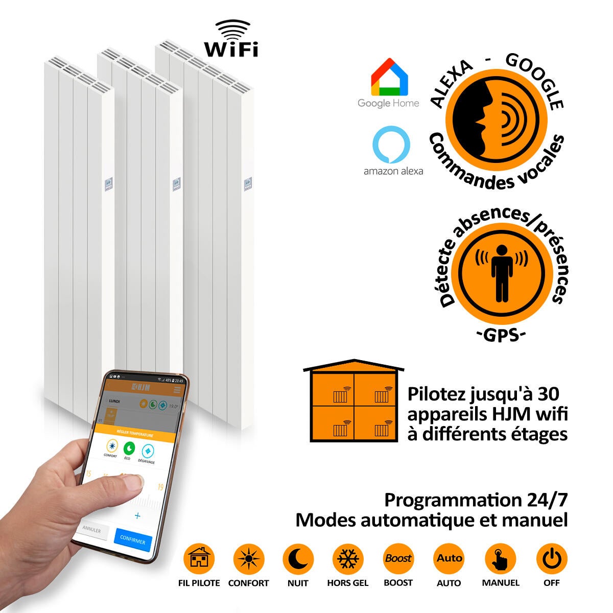 Radiador eléctrico conectado a inercia cerámica. La alta inercia térmica de los bloques cerámicos sigue emitiendo calor incluso después de estar apagados. Genera un calor suave y envolvente, garantizando el máximo rendimiento para un calor agradable y uniforme durante más tiempo. Diseño extraplano. Fachada de aluminio. CONECTADO: desde el smartphone y a través de nuestra app gratuita HJM, podrás controlar la instalación de calefacción de una o varias habitaciones desde donde quieras, cuando quieras, y visualizar y ajustar la temperatura, programar tus radiadores a distancia, gestionar tus ausencias. Sólo necesitas una conexión WiFi donde tengas instalados los radiadores, y donde quieras programar o controlar la instalación a través de tu dispositivo móvil. Modo automático/manual, con 1 programa gratuito. Programación 24 horas al día, 7 días a la semana. MODOS: PILOTO CABLE, CONFORT, NOCHE, ANTIHIELO, BOOST, AUTO, MANUAL, OFF Sus funciones permiten ahorrar en uso y garantizar comodidad y seguridad, gracias a: • Geolocalización GPS: Detecta ausencias/presencias • Compatible con ALEXA, GOOGLE: usa comandos de voz • Detector de ventana abierta. • Sistema inteligente de encendido temprano. • Bloqueo parental. • Limitador de seguridad térmica.